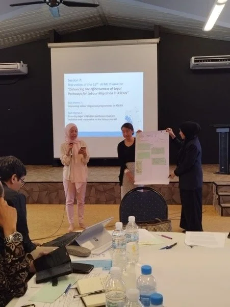 Participants then broke out into two groups to come up with ways to improve ASEAN’s labour migration programmes and enhance legal migration pathways before presenting their ideas to the rest of the group. Notably, Qayyimah led her group’s presentation by discussing how each stakeholder can help improve labour migration programmes. Qayyimah's group proposed the establishment of a regional database containing the skill sets of workers and labourers from Southeast Asia. In addition, Qayyimah suggested the creation of a national database that could effectively match the demands of local and overseas government agencies and employers' organisations when seeking skilled workers and labourers.